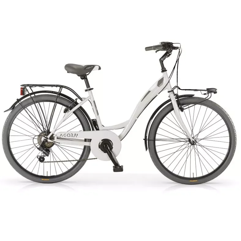 overdimensioneret stel med flade rør, aluminium V-bremser og bremsegreb, aluminiumsnav, batteribelysning, bagagebærer, frontlad.