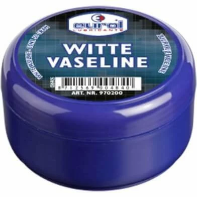 Eurol Witte Vaseline 100 gram. Raffineret petroleumsgel af farmaceutisk kvalitet med et højt renhedsniveau. Det kan bruges som et smøremiddel til emballagemaskiner og applikationer i fødevareindustrien såvel som i den kosmetiske og farmaceutiske industri. Det kan også bruges som fedt til batterikabler og til smørevåben og læder. Det opfylder kravene fra forskellige (internationale) farmaceutiske institutioner, er vandafvisende og tilbyder god korrosionsbeskyttelse.