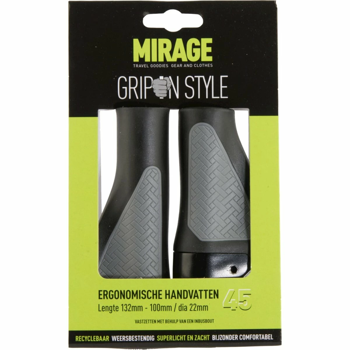 Mirage -håndtag er lavet af en hård plast (PP) i kombination med en blød og behagelig gummi (TPR), som kan fastgøres fast til styret takket være aluminiumsklemmen. Disse håndtag bevarer også deres behagelige greb under våde og kolde forhold. Meget behagelig aluminiumring af høj kvalitet, genanvendelig
