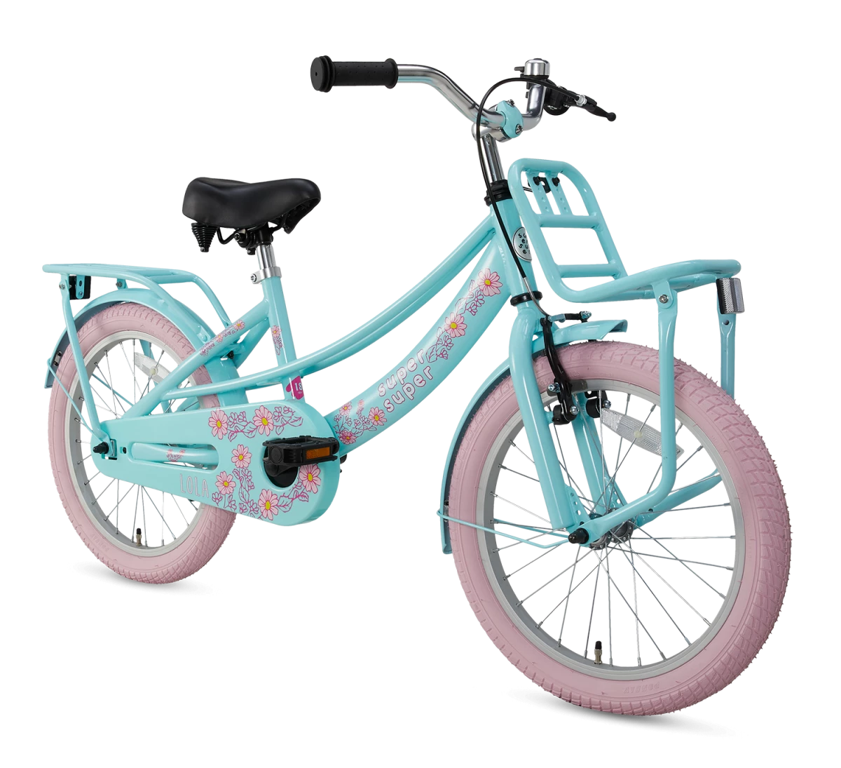 Lola Super Super 18 tommer i mint er en smart pigecykel i let og elegant design takket være cyklens konstruktion og nøje udvalgte farver – rammen i mint med cykeldæk i sart rosa farve. Cyklen er med både bagagebærer og frontlad, hvilket er en super praktisk løsning, specielt når man skal cykle med skoletaske og lign. At montere en cykelkurv er også en mulighed.