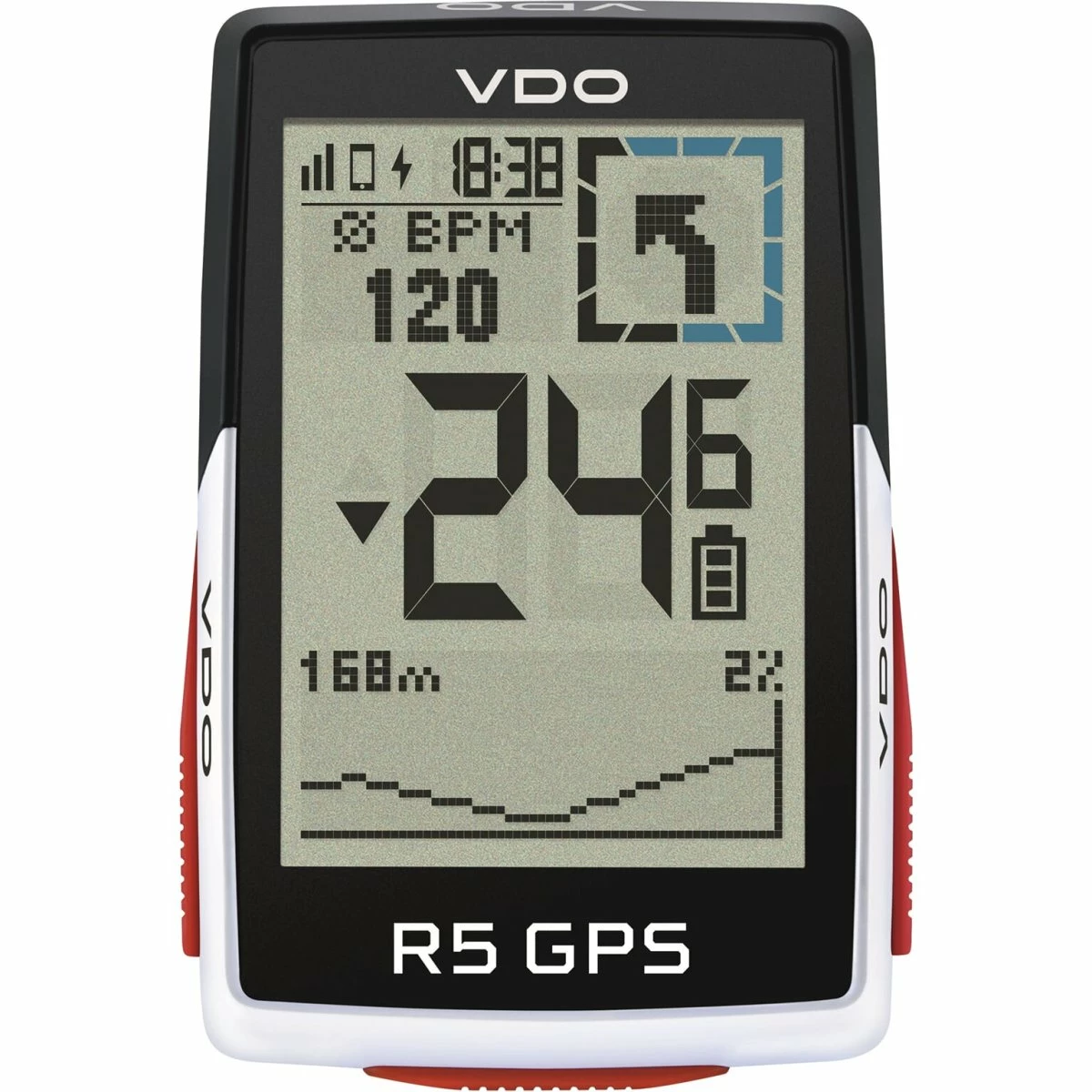 Stor 2,4 tommer display, brugervenlige og 34+ træningsfunktioner: R5 GPS er topmodellen fra VDO R-serien til alle dine sportslige rejser på din racercykel, gruscykel eller mountainbike! Alle vigtige grundlæggende data, såsom hastighed og rideafstand, måles enten via GPS eller via leveret magnetisk hastighedssensor til endnu mere nøjagtig måling. Et reelt højdepunkt er den integrerede barometriske lufttryksensor til nøjagtig højde måling inklusive visning af stigningen%. Denne computer adskiller sig også gennem praktisk spornavigation og søgning & gå navigation med turn-by-sving-instruktioner. En markant blå firkant i øverste højre hjørne af skærmen gør en ny måde muligt at vise træningsdata eller drejning-for-sving-instruktioner. Flere data såsom hjertefrekvensmåling eller måling af pedalfrekvens er mulig via leverede ANT+og BLE -sensorer til hjerterytme og kadence. Hvis du er færdig med din træning, kan du hurtigt uploade dataene til Strava og Komoot (automatisk). Sammen med den kompatible Sigma-VVDO Ride-app kan du også indstille dine træningsskærme individuelt eller vise smarte meddelelser. Derudover kan det knyttes til kompatible e-cykler. VDO R5 GPS leveres med en over Clamp Butler, der placerer GPS -computeren centralt på rattet lige over stilken. Denne indehaver passer ind med styring med en diameter på 31,8 til 35,0 mm.